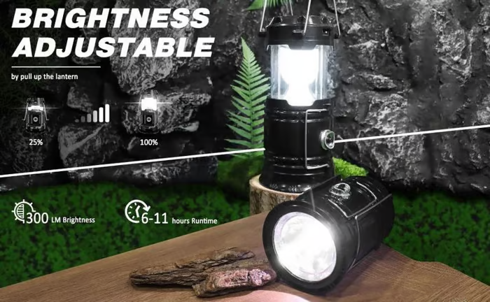 Switch between 360° area lighting and a focused flashlight beam with ease! The collapsible body lets you adjust brightness and function instantly – perfect for setting up camp or navigating dark trails. 🏞️🔦